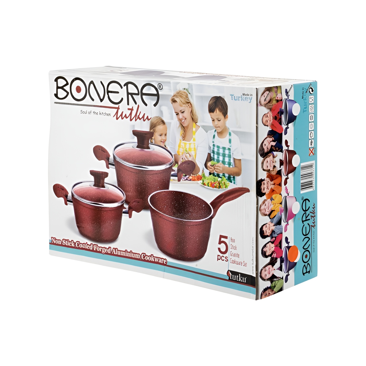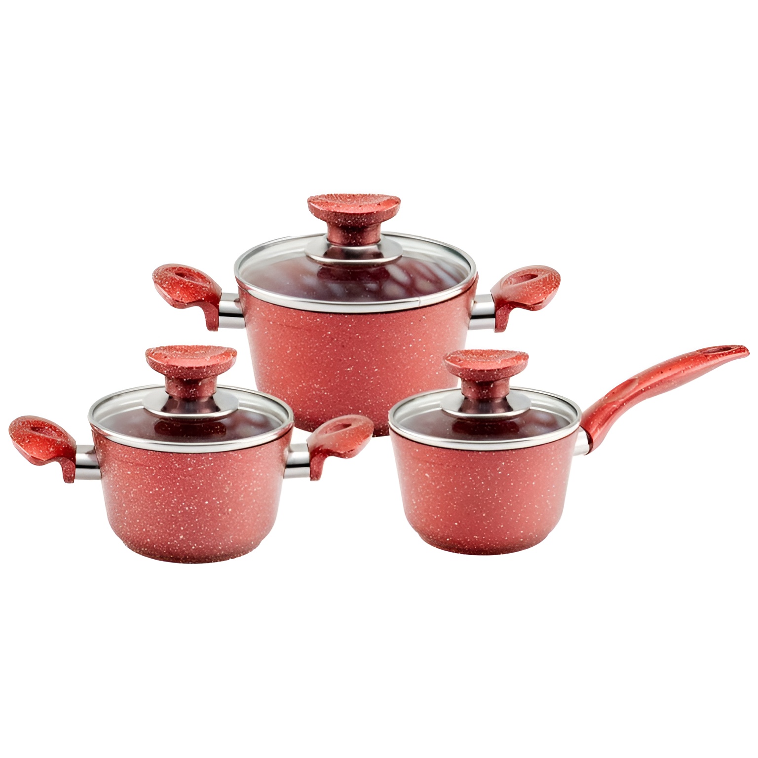 ست قابلمه 5 پارچه از گرانیت نچسب است. این سرویس در 4 رنگ یاسی، صورتی، بنفش و قرمز قابل سفارش است. این سرویس قابلمههای کوچک مناسب پخت و پز در حجم بسیار کم است.